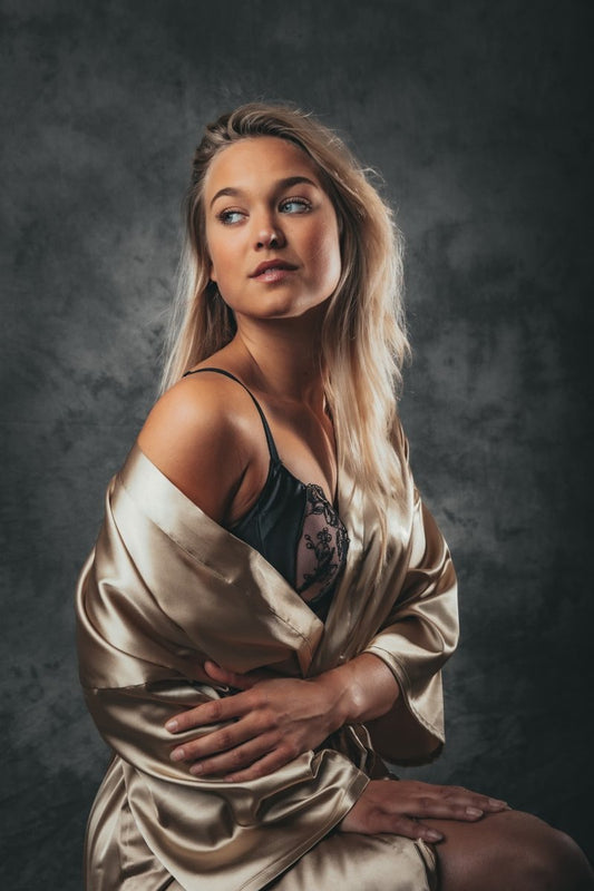 A satin kimono also makes a beautiful gift for someone else. Wrapped in luxurious gift packaging, it becomes a story, a memory, a sign of care. With a women's dressing gown , you give someone an experience of softness and elegance. Add a satin pajama set , a satin pillowcase , or a silk sleep mask , and you have a beautiful set full of self-care. Whether you choose a short or long kimono , you're giving yourself or someone else a gift that will be worn and cherished. It's the kind of gift that envelops someone again and again, literally and figuratively. At Kimomi, we believe that every woman deserves to feel beautiful, powerful, and relaxed. Our kimonos convey just that. Treat yourself or someone else to the softness and strength of a Kimomi kimono.