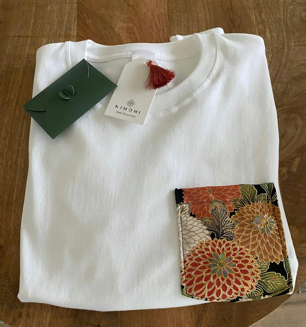 Ontdek de Limited edition Golden Kiku, een exclusief T-shirt uit de Kimotee Treasures Collection. Elke borstzak is met zorg met de hand uitgesneden uit authentiek vintage kimono-textiel uit Kyoto, waardoor geen enkel shirt hetzelfde is. De gouden, oranje en dieprode chrysanten brengen kleur en betekenis in je look; in Japan symboliseert de chrysant (kiku) een nieuw begin, vitaliteit en het koesteren van het moment.